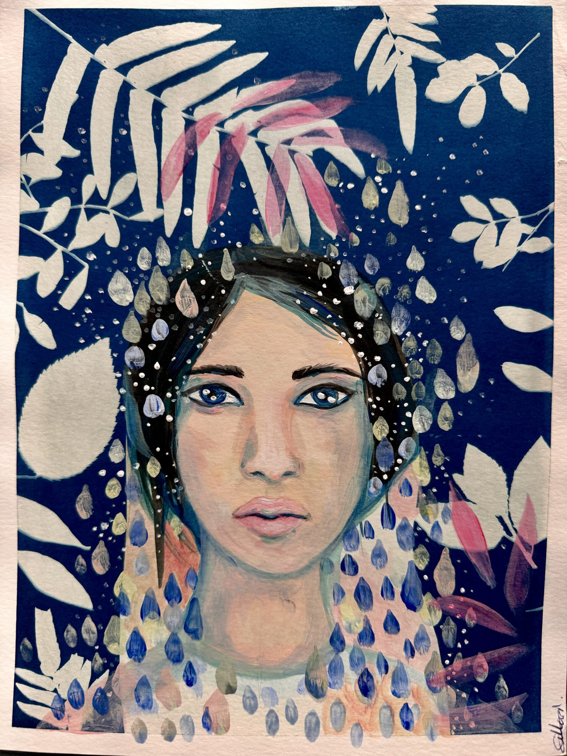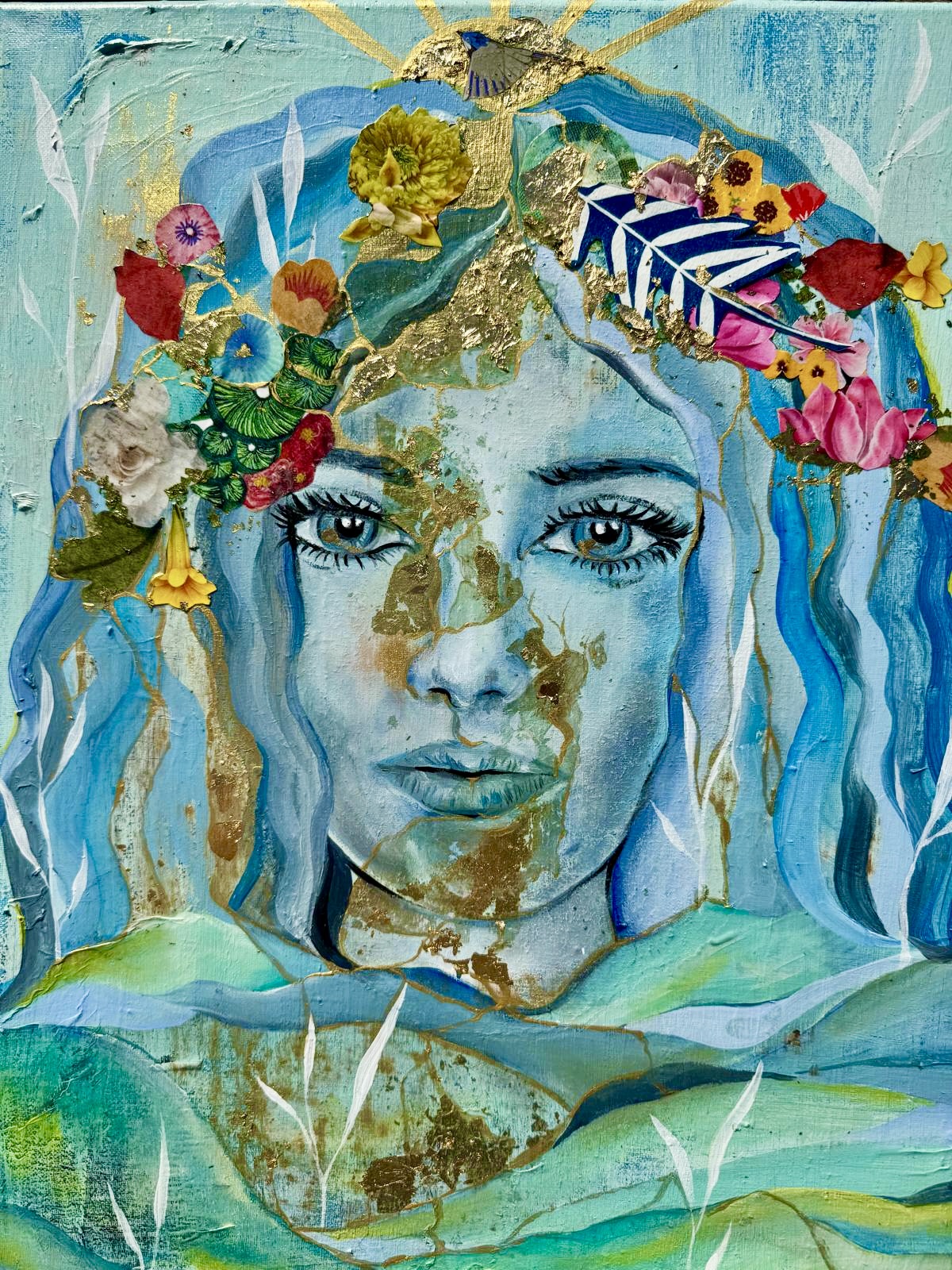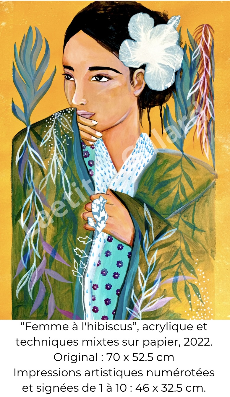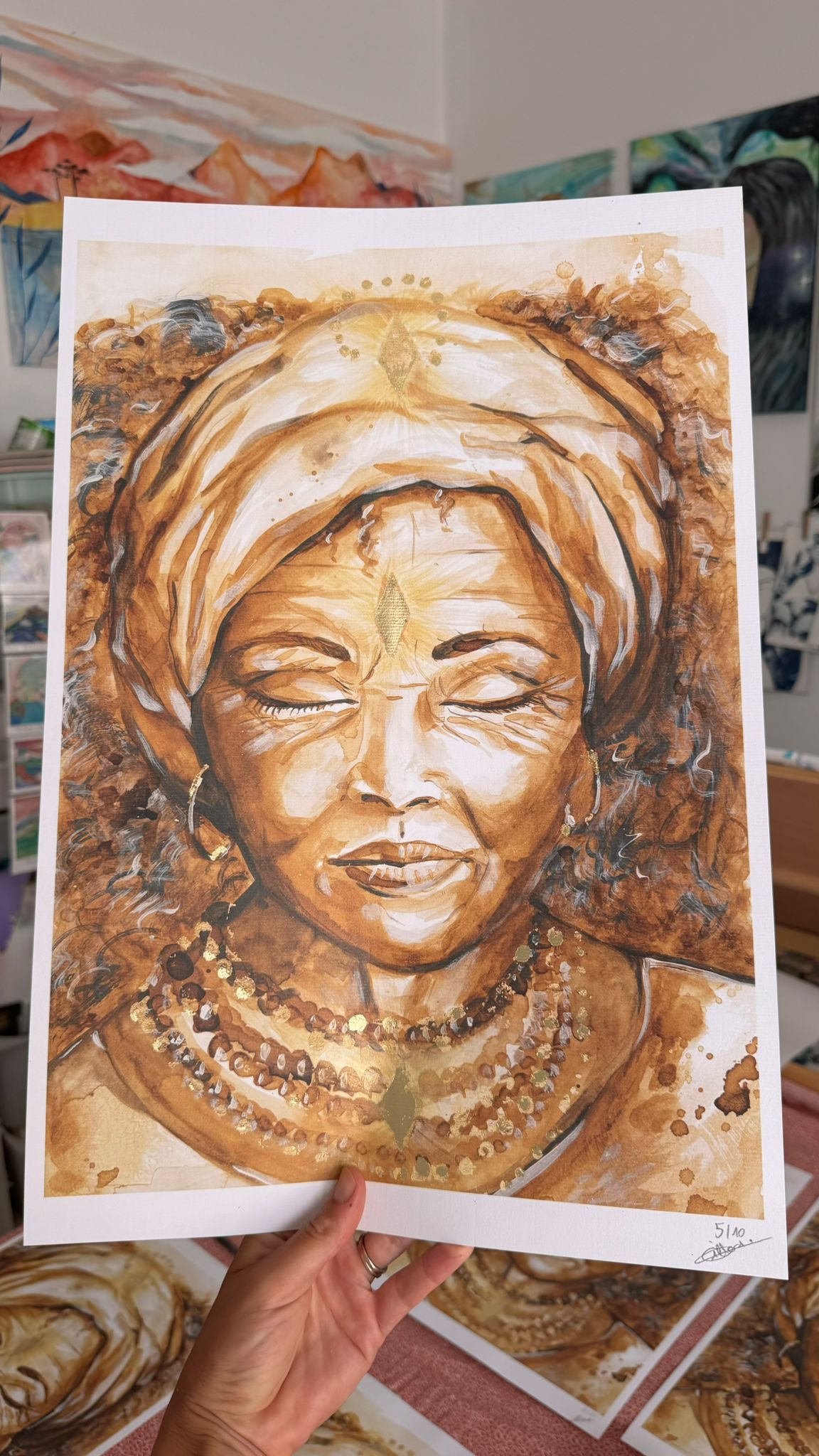 Je peins à l’acrylique, avec du café, ou encore à l’aquarelle. J’utilise aussi le doré sous forme de feuille d’or ou de peinture dans mes créations.